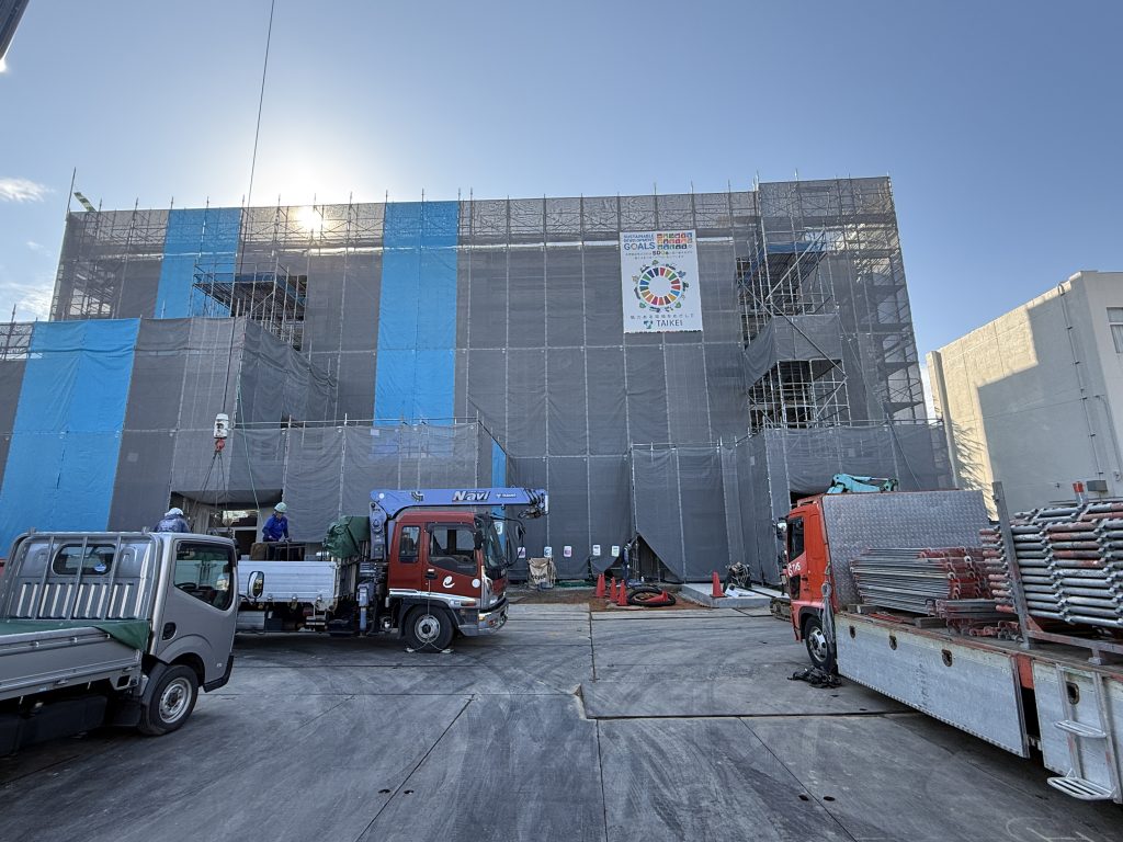 お知らせ 建設工事の様子(11月14日) 2025年11月14日 中学校舎は4階まで躯体ができました。 中学体育館は外部足場が解体されて屋根や外壁が見え、外観が分かるようになりました。 着実に工事が進んでいます。