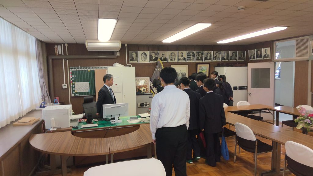 上:吹奏楽部による歓迎セレモニー 下:学校見学【校長室】