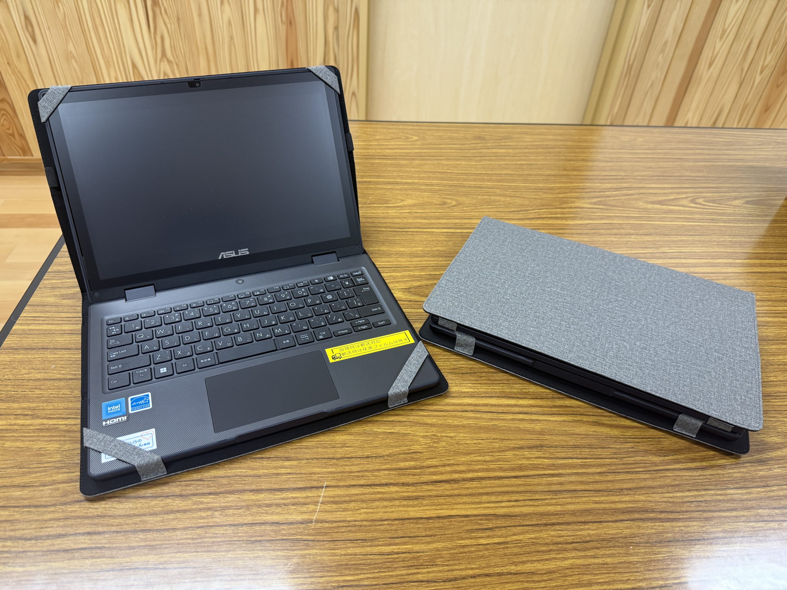 4月から生徒に貸与する学習用タブレット端末が決まりました。資料を添付いたしますのでこちらからご確認ください。型番は一番左のものになります。本体のサイズは、資料の通りになりますが、本体に保護カバーがつきます。保護カバーがつきますと表示サイズより少し大きくなります(写真参照)。持ち運び用の袋をご準備いただく際は、資料の表示サイズを参考にしていただくか、実際にお子さんが持ち帰ったものを確認していただきご準備いただければと思います。